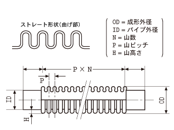 本機の特長は、エラストマーを使用せず、金型で成形を行うことにあります。このため、寸法変動が少なく、厚肉のパイプも成形可能で、山数、山高さ、ピッチ、間欠山など、ご自由に選べます。また、薄肉のパイプの成形やミニサイズも製造可能です。